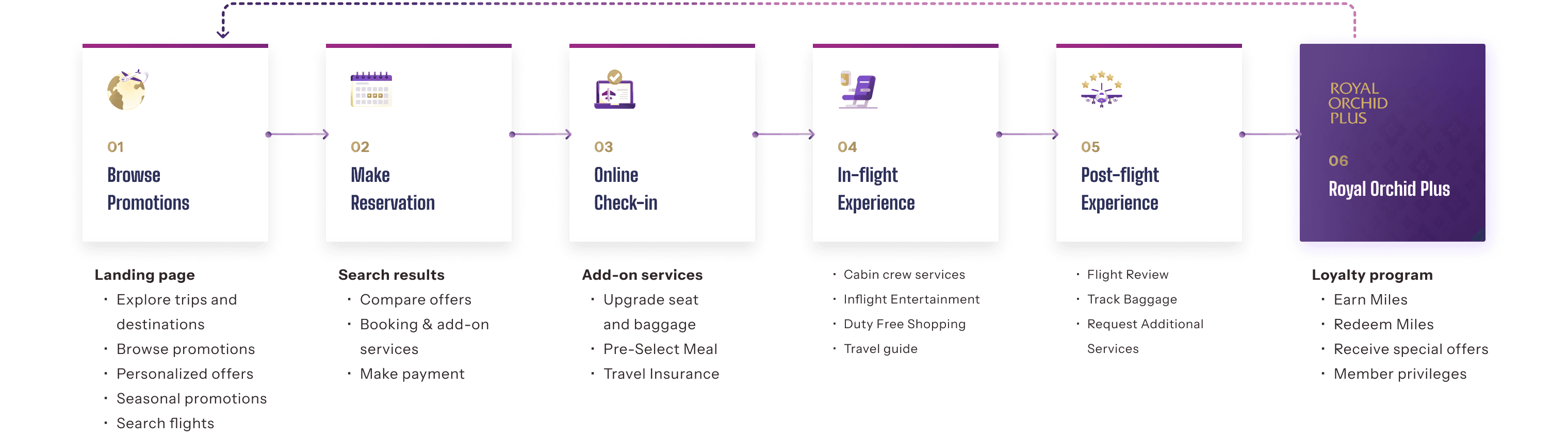 Alongside our analysis of the existing website, we identified clear usability gaps. Through competitor research focused on key touchpoints such as the homepage and booking flow, we uncovered a major insight: the absence of a destination section on the homepage. This element was consistently present across competitor platforms and highlighted a critical opportunity to better support early-stage trip exploration on the Thai Airways site.